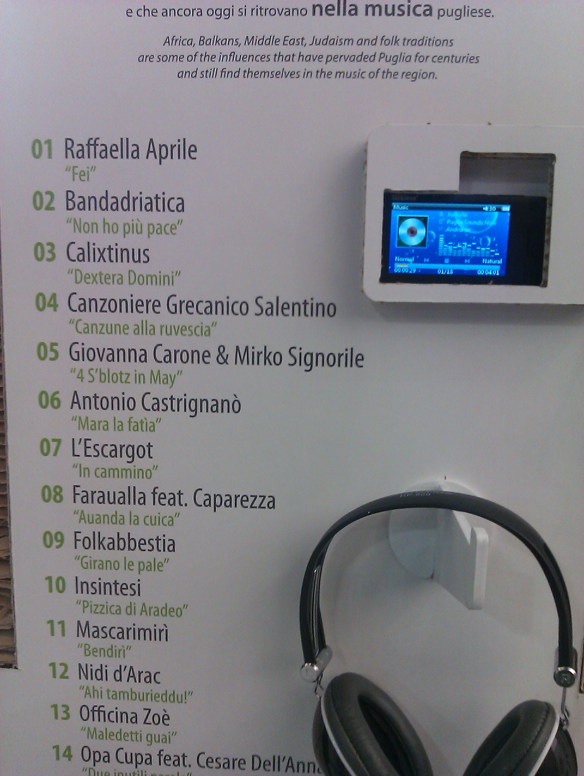 Tra tutti quelli visti (non tutti) uno in particolare mi è piaciuto: quello della Puglia. Primo per l’allestimento: molto lo spazio lasciato al visitatore. Poi mi è piaciuta l’idea di diversificare lo stand al suo interno a seconda delle aree (Taranto, Bari) ma soprattutto mi è piaciuto per il punto di ascolto degli artisti pugliesi o che con il territorio hanno avuto qualcosa a che fare.