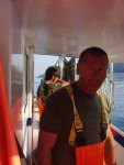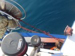 Finito il breve tour dovevamo tornare, ma ci pensa un po’ su e alla fine ci fa portare il suo gommone, anzi ce lo lascia, perché non lo può trainare: nuovo divieto per lui. Non è contento, ma ubbidisce e ci affida quella scheggia rossa, piccola, leggera e carica di voglia di mare. Tanto lui non lo usa, non lo può portare con sé. Anche questa borbotta.